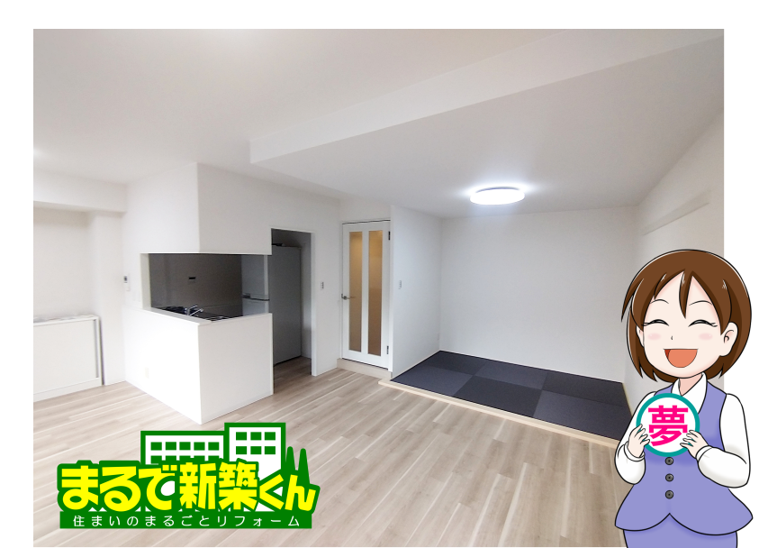 購入時は快適だったマンションも 年月を重ねてくるとインテリアが 色あせてきたり水まわりが使いにくくなったりと、 さまざまな悩みがでてきます。 また、家族のライフスタイルの変化に 合わなくなってきていることもあるでしょう。 そんな方におすすめするのが、 マンション定額制フルリフォーム「まるで新築くん」です。 マンションのお部屋の広さで工事価格が決まる定額制で 標準工事に内装・水まわり工事など 新築時のように一新するフルリフォーム工事をパッケージ。 愛着ある住まいを新築のように快適に生まれ変わらせます。